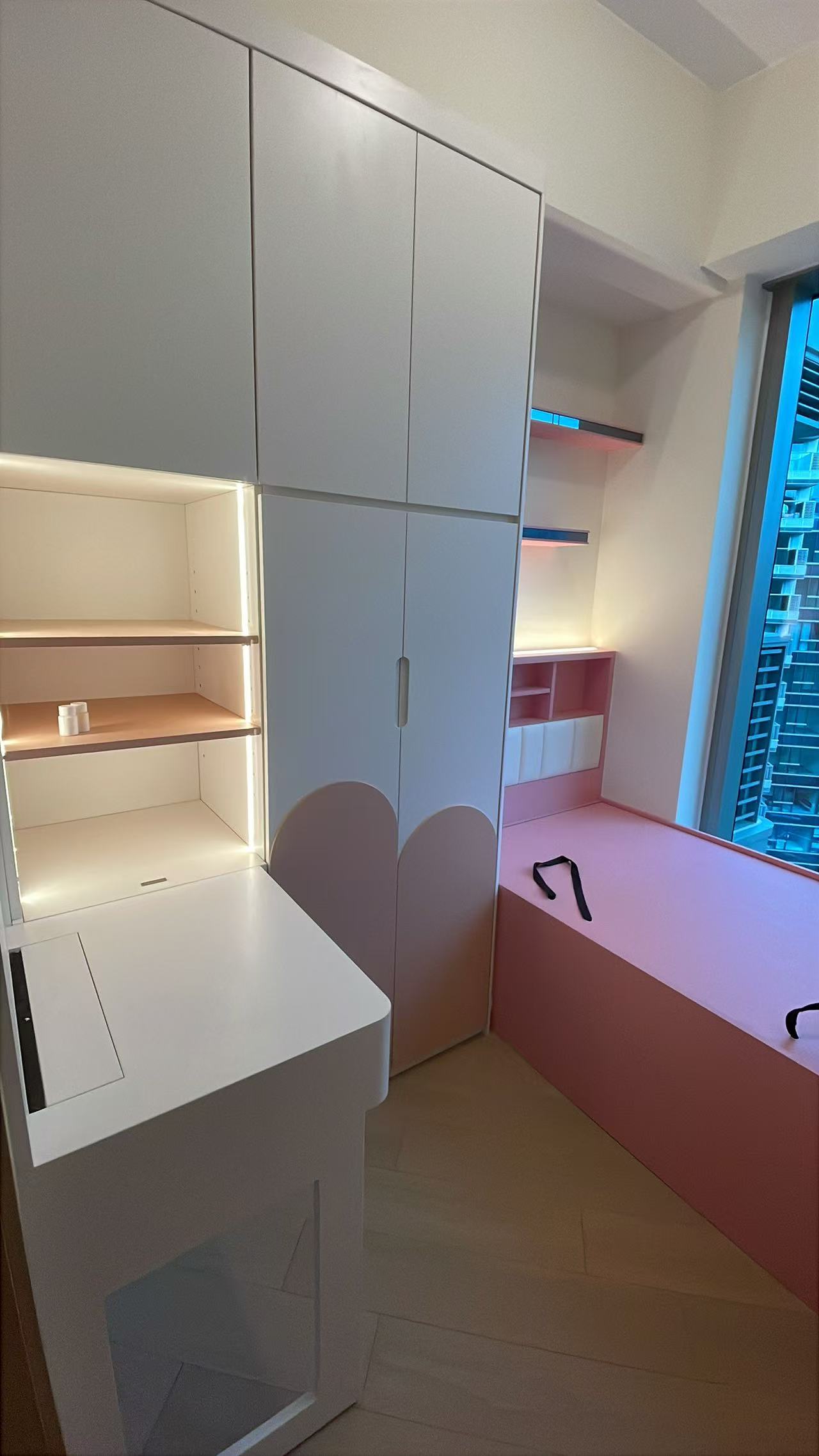 設計師利用訂造傢俬將原本的一房單位分隔成兩房,設計雙面可開大衣櫃能夠分隔房間之餘收納空間也倍增,兒童房設計組合床並於下方設置書桌,睡房則設有地台收納空間,這樣一套訂造傢俬既省去了建立新牆的成本又能建造功能性極強的兩個空間。