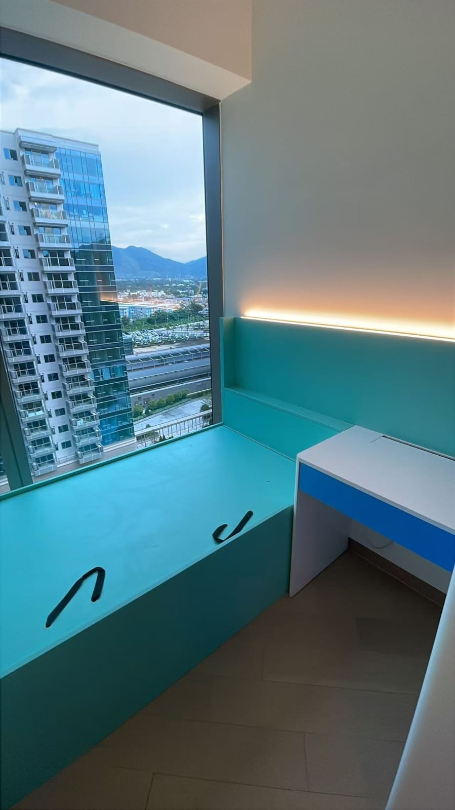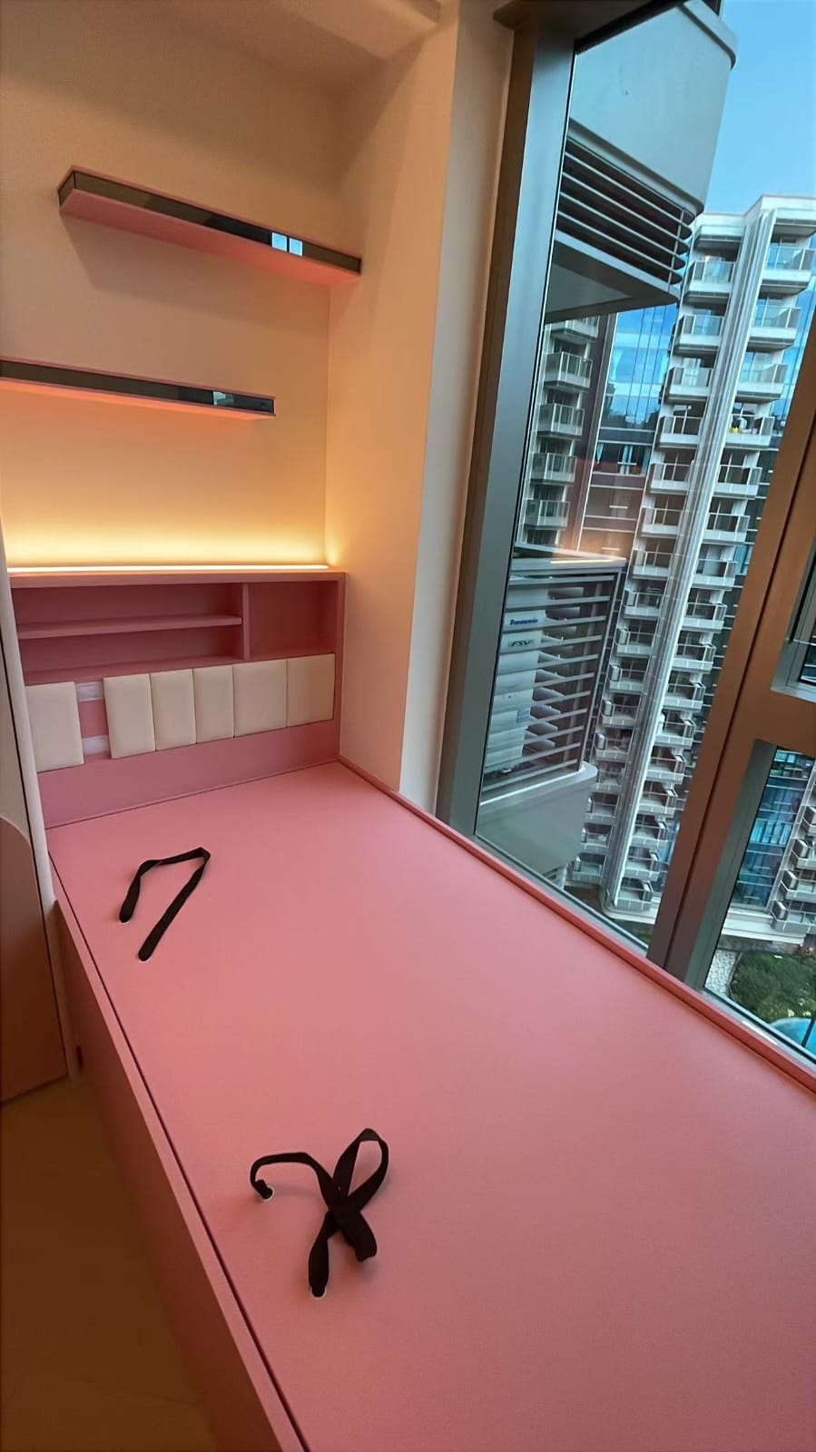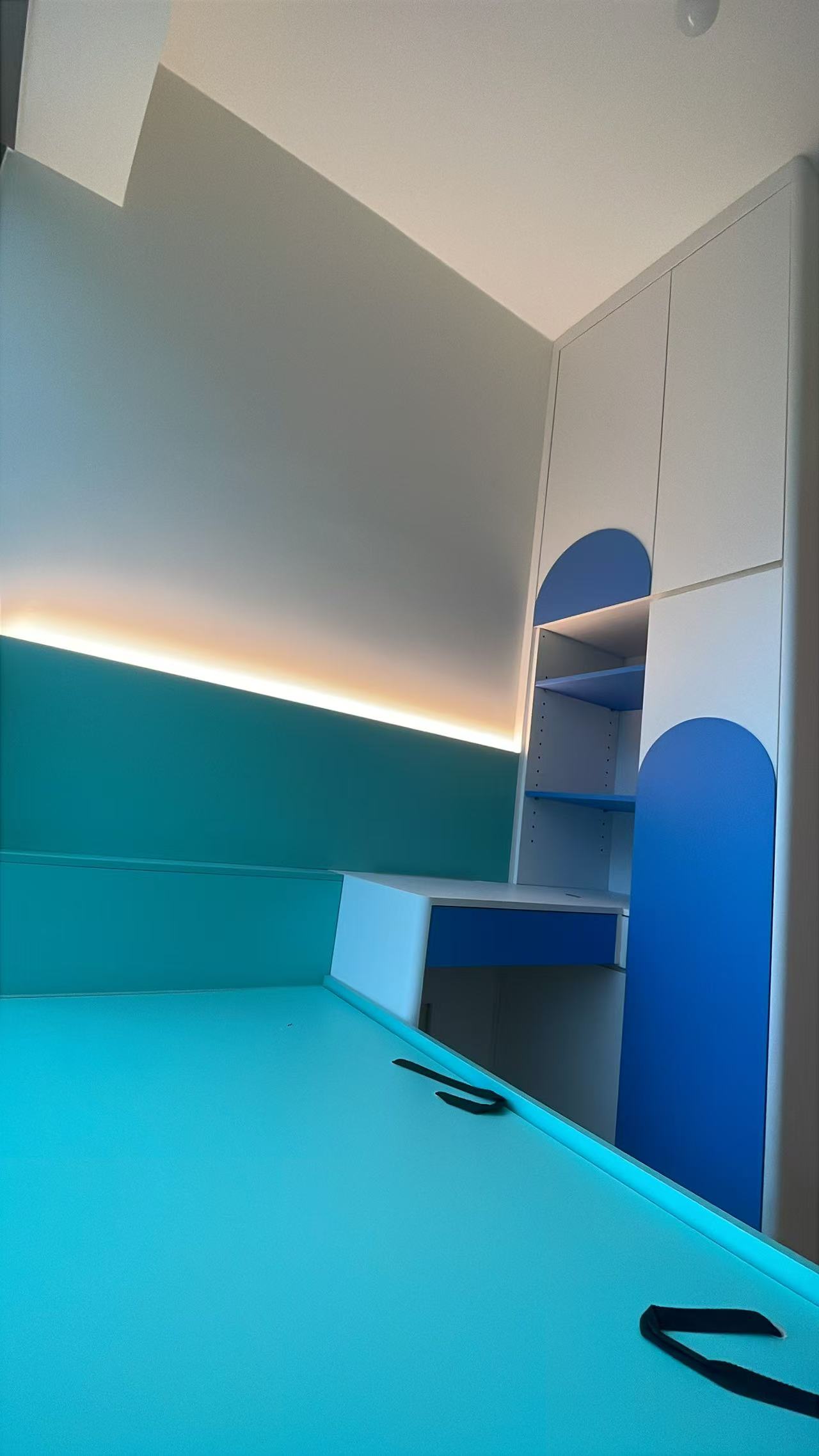 設計師利用了組合床在狹窄的房間為孩童提供生活所需,在床下設計書桌和衣櫃既不佔地方又美觀,側旁的樓梯櫃亦提升了整體房間的儲物空間。半圓的圖形組合令房間氣氛更活潑,孩童更可自由選擇喜愛的顏色,度身訂造成長的小天地。