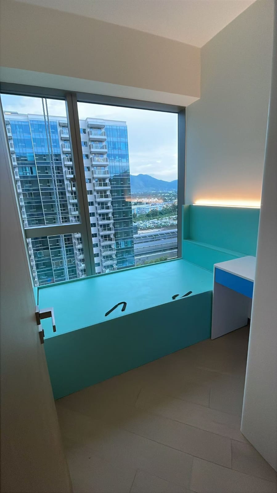 設計師利用海洋主題設計了兒童房,淡藍色與白色的搭配迎合孩子的口味,在狹窄的空間裡盡用分寸,設計了上衣櫃下床和書桌,並配有層架作書本收納,讓孩子擁有舒適的學習空間。